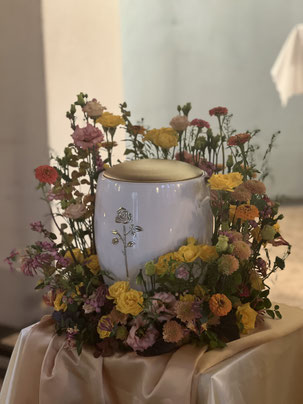 Für die weitere Gestaltung entscheiden Sie, ob Sie ein Bild aufstellen möchten, Trauerkarten oder Sterbebildchen erstellt und verteilt werden und welche besonderen Wünsche Sie berücksichtigt haben wollen, z.B. die Gestaltung mit Lieblingsblumen.